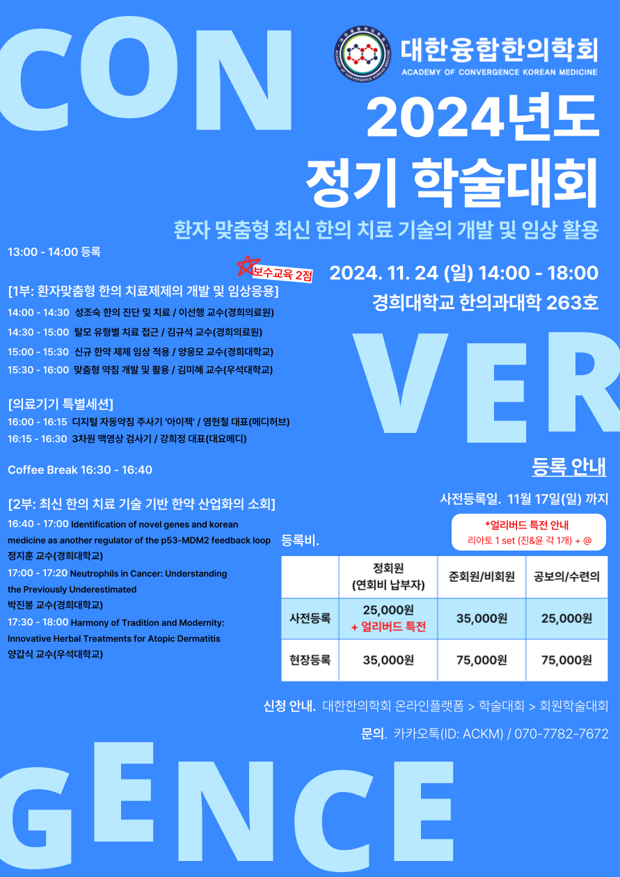 대한융합한의학회에서는 [환자 맞춤형 최신 한의 치료 기술의 개발 및 임상 활용]의 주제로 2024년 정기학술대회 및 보수교육을 실시합니다.
